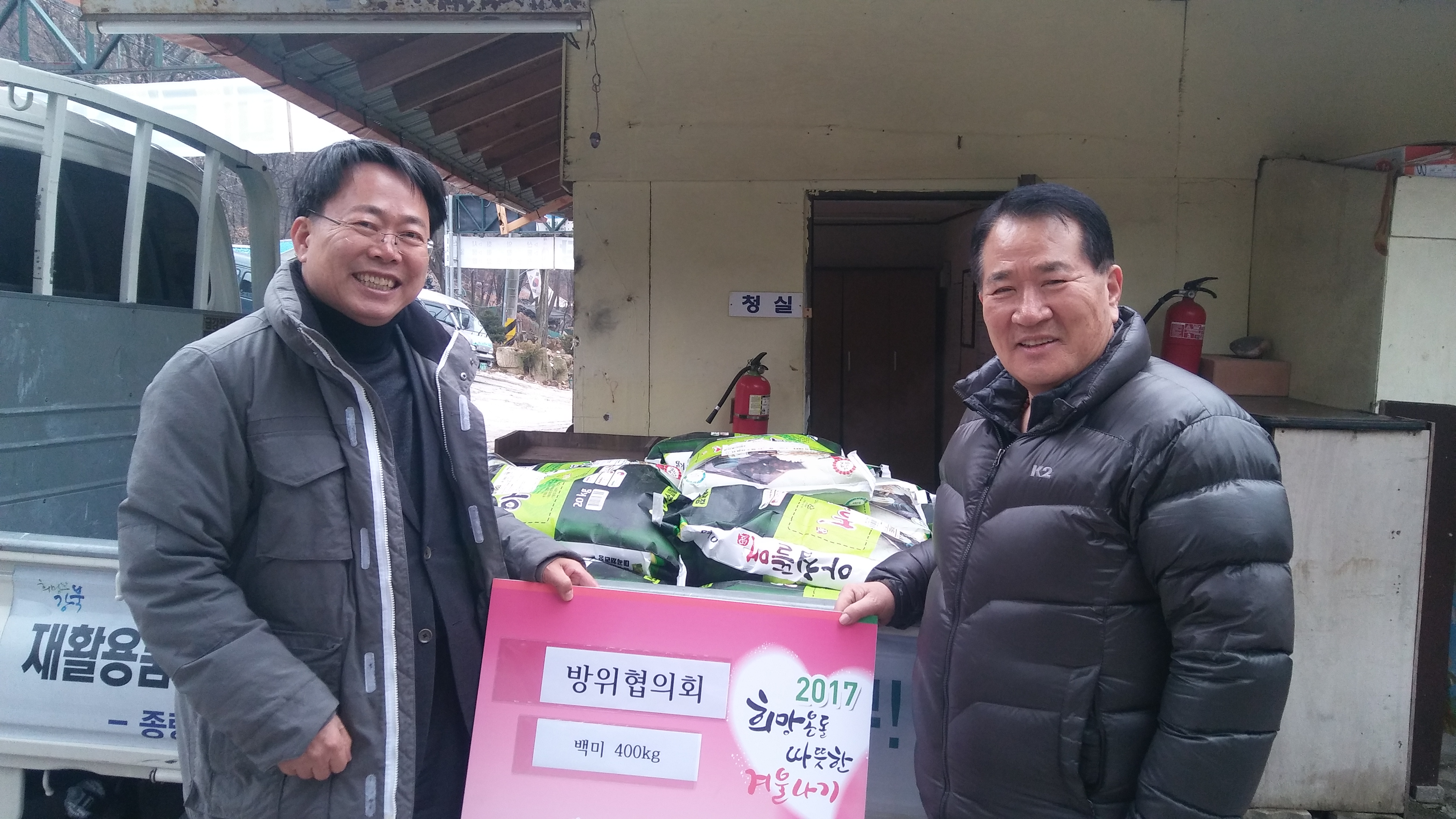 2016.12.26.(월) 우이동 방위협의회와 박순재 방위협의회 회장이 각각 20kg짜리 쌀 20포씩 총 40포를 어려운 이웃들에게 전해 달라고 우이동장(박순종)에게 전달하였다. 박순재 우이동 방위협의회 회장은 우이동 먹거리마을에서 미림산장 식당을 운영하고 있다.