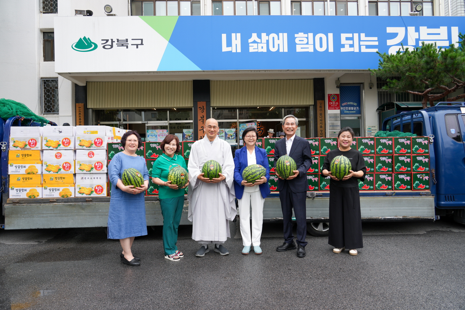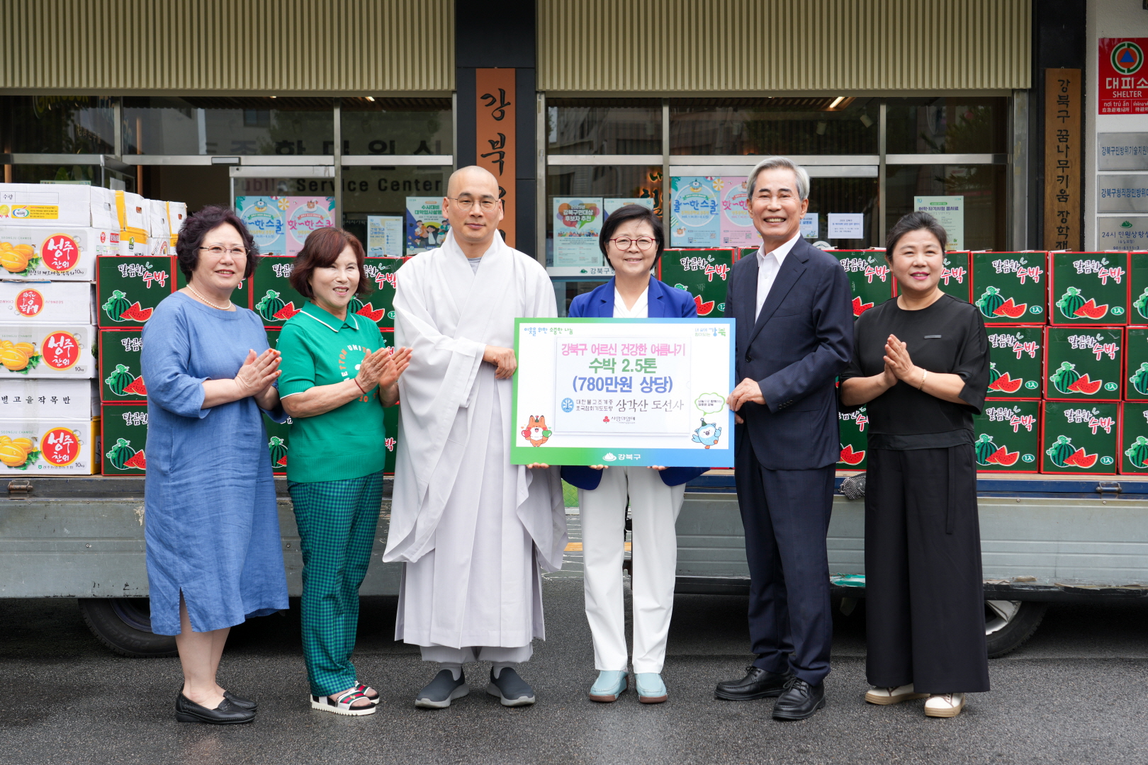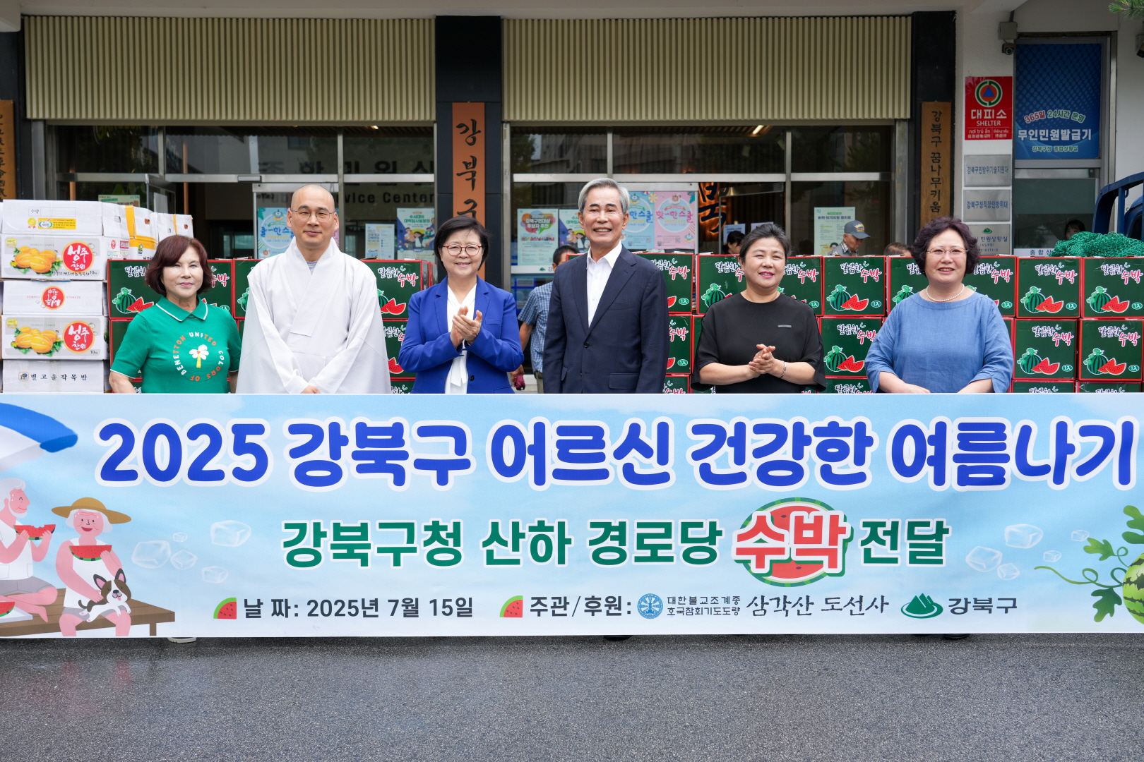7월15일 강북구청 구청광장에서 <2025 강북구 어르신 건강한 여름나기-강북구청 산하 경로당 수박 전달식>이 열렸습니다.
