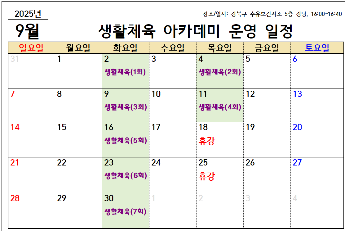 2025 드림스타트 [생활체육 아카데미] 9월 운영 변경일정