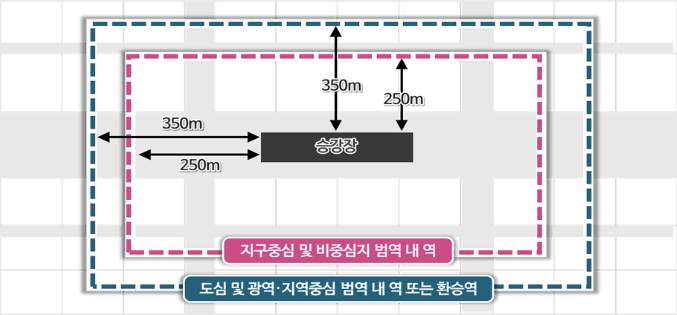 - 지구중심 및 비중심지 범역 내 역(환승역 제외) : 250m