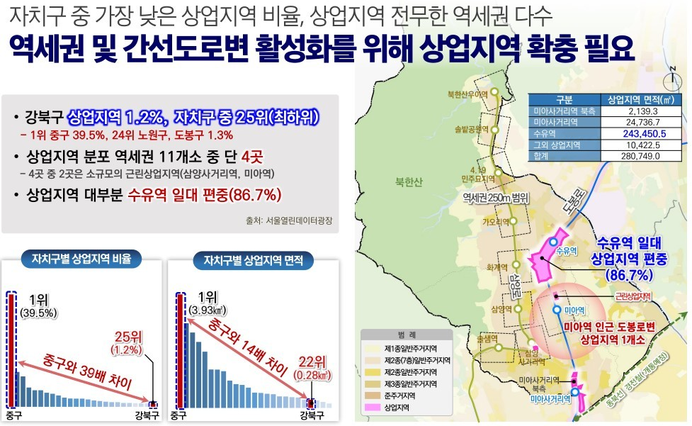 강북구는 상업지역 비율이 1.2%로 25개 자치구 중 25위로 가장 낮아 상업지역 확충이 필요하고, 상업지역이 대부분 수유역 일대에 편중됨에 따라 타지역으로의 상업지역 확충이 필요합니다.