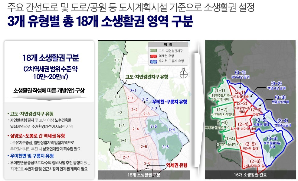 고도지구·자연경관지구 지역, 역세권 지역, 우이천변과 오패산 지역을 총 18개 소생활권 영역으로 구분하여 정비방안을 수립할 예정입니다.